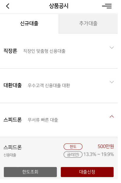 2. 세번째 스피드론을 선택한후 대출 신청버튼을 선택합니다